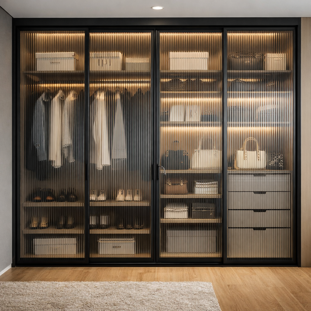 • Equilíbrio entre luz natural e privacidade: o vidro canelado filtra a luz sem bloquear totalmente a visão, criando ambientes claros e acolhedores sem expor completamente o que está atrás dele.